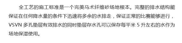 VT-TEX混合纤维是使用比较广泛一种马术场地纤维,它的优点是杰出的耐久性和纤维与砂之间的牢固性,同时配合橡胶隔离层的使用,更大的使纤维砂场地的保水性与排水性得到了优化与平衡。